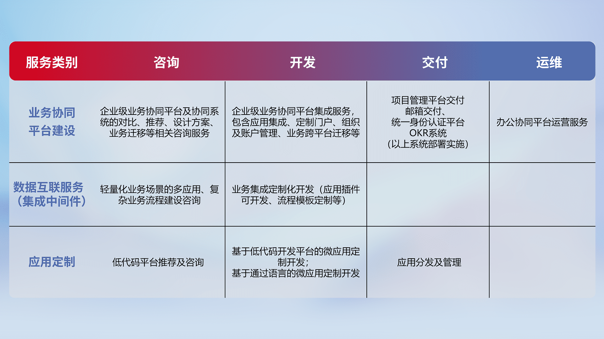 针对钉钉、、、、企微、、、IDaas等平台级产品提供产品的规划、、方案、、、、交付、、、、定制化开发等服务,,,,实现如统一协同办公、、、、智能客户服务、、、混合会议管理、、智能数据查询、、等业务场景,,,实现数字化转型。。。